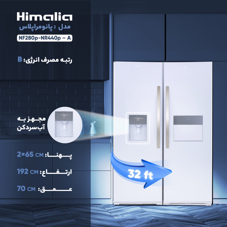 یخچال و فریزر دوقلو هیمالیا مدل NF280p-NR440p از تولیدات برند هیمالیا و مجهز به آبسردکن و یخساز اتوماتیک است. کنترل الکترونیکی هوشمند مجهز به سیستم عیبیاب از قابلیتهای مهم آن به شمار میرود. یخچال این محصول دارای محفظههای نگهداری میوه و سبزیجات همراه با کنترل رطوبت (Moisture Balance) است که به همین دلیل مواد غذایی و اقلام خوراکی قرار گرفته در این محفظهها مدت زمان طولانیتری باطراوت و تازه میمانند. LED داخلی و نمایشگر لمسی از دیگر ویژگیهای یخچال و فریزر هیمالیا مدل پاناروما هستند. شرکت سازنده هنگام تولید این محصول آن را به فیلتر آب مجهز کرده است بنابراین از تهیهی آب تصفیه شده برای آشامیدن بینیاز خواهید بود. هوم بار قرار گرفته در قسمت یخچال امکان دسترسی شما به مواد غذایی و خوراکیهایی را که بیشتر مورد استفاده قرار میگیرند فراهم میکند و میتوانید بدون باز کردن درب اصلی یخچال از آنها استفاده کنید. به این ترتیب مصرف انرژی محصول هم بهینهتر خواهد بود.