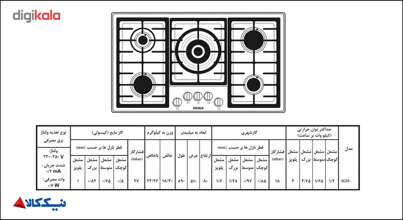 توان حرارتی شعله بزرگ 2.65 کیلوات بر ساعت (2 عدد) توان حرارتی شعله متوسط 1.65 کیلوات بر ساعت توان حرارتی شعله کوچک 1.25 کیلوات بر ساعت