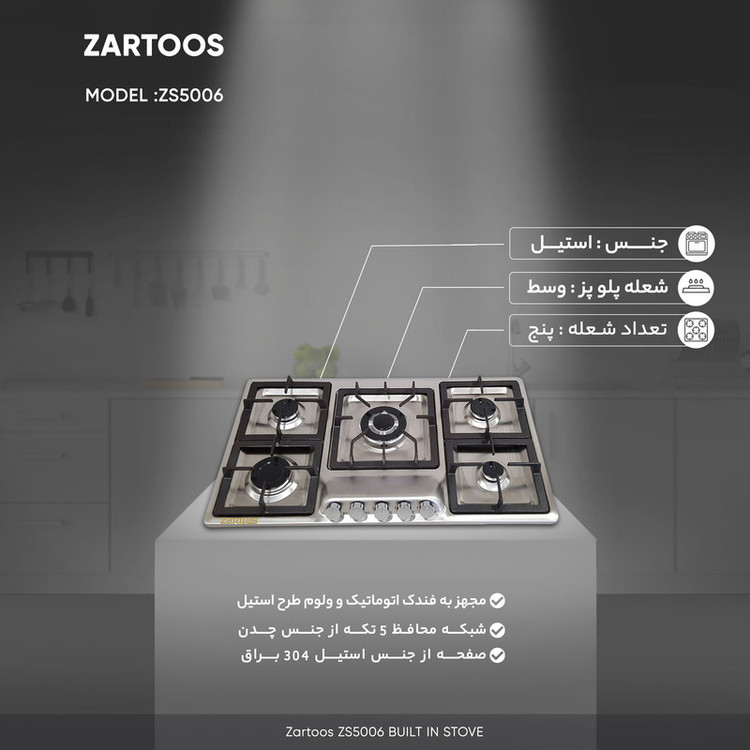 اجاق گاز صفحه ای زرتوس مدل 5006 یکی از مدل های زیبا و پر کاربرد در محصولات این شرکت است . این اجاق گاز دارای صفحه ای استیل و مقاوم در برابر زنگ زدگی میباشد. برآمدگی پشت ولوم این مدل باعث جلوگیری از داغ شدن ولوم های این اجاق گاز شده است. در این مدل از یک پلوپز,دو شعله متوسط ,یک شعله بزرگ , یک شعله شعله کوچک استفاده شده است.تمامی قطعات این اجاق گاز از برترین برندهای ایرانی میباشد که باعث افزایش راندمان کاری این مدل شده است.