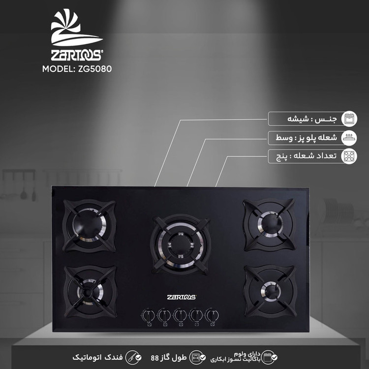اجاقگاز یکی از مهمترین وسایل هر آشپزخانهای است. اگر قصد خرید یک اجاقگاز با کیفیت و مرغوب را دارید؛ اجاقگاز صفحهای زرتوس مدل ZG5080 بی شک انتخاب مناسبی است. این مدل دارای طراحی ظریف و شکیلی است که نظر همه افراد را به خود جلب میکند و از همه مهمتر شرکت زرتوس از قطعات باکیفیت و فناوری بهتری در این مدل استفاده کرده است. این مدل پنج شعله بوده که یکی از محبوبترین و پراستفادهترین محصولات در بازار است. اجاقگازهای پنج شعله برای خانوارهای کم جمعیت و پر جمعیت نیز مناسب است و به خوبی نیازهای مصرفی آنها را پاسخ میدهد. زرتوس در ساخت این مدل از جنس شیشه استفاده کرده که وجود چنین صفحه گازی باعث زیبایی چند برابر محیط آشپزخانه شما میشود اما تمیز کردن آن را کمی دشوار میکند. فندک اجاق گاز به صورت اتوماتیک کار میکند که شما بتوانید سریعاً اجاق را روشن کرده و پخت و پز را شروع کنید.