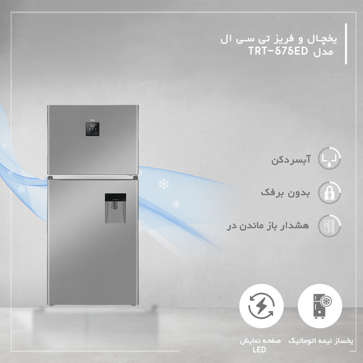 یخچال و فریز تی سی ال مدل TRT-575ED از گروه یخچال و فریزرهای شرکت معتبر «تی سی ال» (TCL) بوده که از نوع ۲ در است. طراحی محصول ساده و در عین حال زیبا است. گنجایش یخچال برابر با 395 لیتر و گنجایش فریزر آن برابر با 123 لیتر است. برای این محصول صفحهنمایش LED در نظر گرفته شده است. مصرف انرژی برای دستگاههایی مانند یخچال و فریزر که بهصورت شبانهروزی در حال کار هستند، اهمیت زیادی دارد. مصرف انرژی این دستگاه A+ است که آن را در گروه دستگاههای کممصرف قرار میدهد. داخل یخچال و طبقاتی در نظر گرفته شده است تا مواد غذایی و ظروف مرتب چیده شوند. این طبقات از استحکام بالایی برخوردارند و در برابر وزن مواد غذایی مقاومت زیادی دارند. همچنین این محصول دارای قابلیت Multi Airflow است که باعث میشود. دمای یخچال در همه قسمتهای آن حتی زمانی که درِ آن باز است، یکسان باشد. همچنین در این حالت مواد غذایی با رطوبت مناسب تازه میمانند. فریزر این محصول دارای تکنولوژی نوفراست برای بدون برفک بودن است.