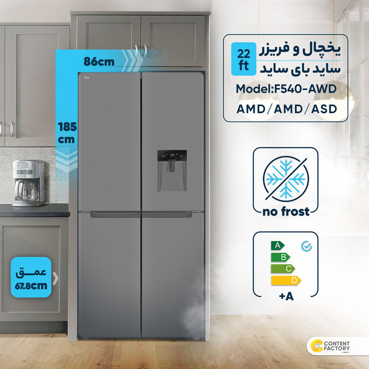 یخچال و فریزر تی سی ال مدل F540-AWD/AMD/AMD/ASD محصولی از برند « تی سی ال » (TCL) است که با طراحی 4 در روانه بازار شده است. گنجایش یخچال در این محصول برابر با 296 لیتر و گنجایش فریز برابر با 133 لیتر است. داخل یخچال و طبقاتی در نظر گرفته شده است تا مواد غذایی و ظروف مرتب چیده شوند. این محصول به صورت نوفراست (No Frost) است. قابلیت برفکزدایی خودکار این محصول، بهطور خودکار یخها را ذوب و آب حاصل از برفکزدایی را بدون دخالت کاربر تبخیر میکند. یخچال و فریزر تی سی ال مدل F540-AWD/AMD/AMD/ASD دارای برچسب انرژی A+ است که آن را در رده کالاهای کممصرف قرار میدهد. طراحی داخلی بهینه در هر دو بخش یخچال و فریزر آن انجامشده است تا فضای بزرگی برای استفاده در اختیار کاربر قرار بگیرد. این یخچال فریزر برای خانوادههایی با جمعیت متوسط گزینهی بسیار خوبی محسوب شده و باعث میشود بتوانند مواد غذایی موردنیازشان را حفظ کنند.