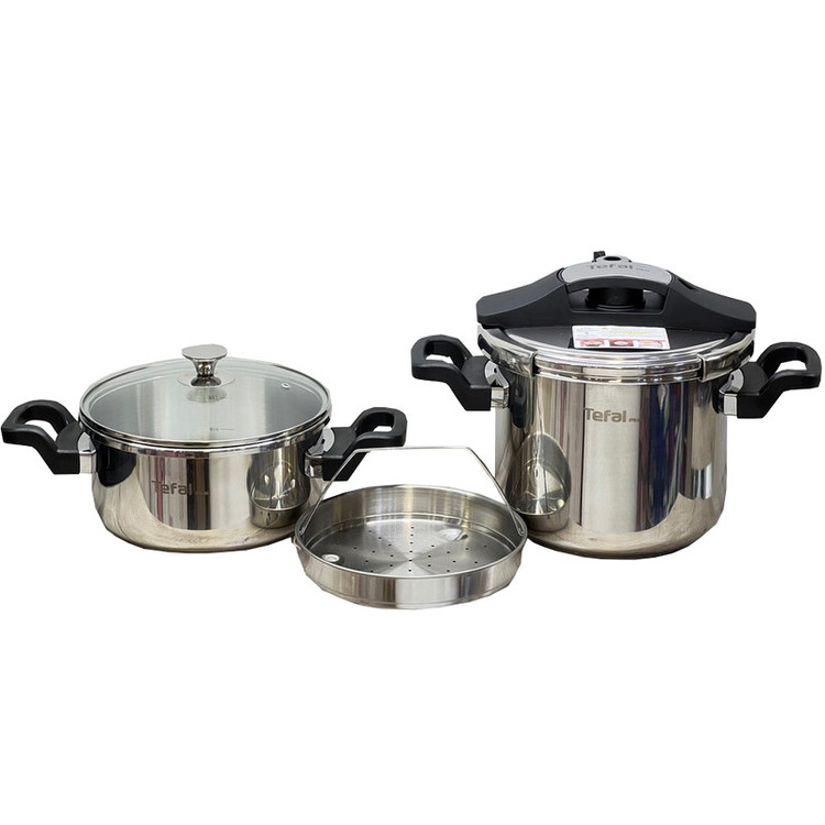 شرکت تفال یکی از معتبر نرین شرکت های لوازم خانگی در دنیا می باشد این این محصول زودپز از استیل درجه یک 18.10 اعلاترین استیل دنیا ساخته شده است این محصول دوقلو می باشد که یک قابلمه آن 7 لیتری و قابلمه دیگر آن 5 لیتری می باشد که درب هردو می توان مشترک استفاده کرد و از دیگر خصوصیات این محصول اینداکشن بودن کف سه لایه می باشد که مقاوم می باشد در برابر حرارت و زخیم بودن کف زودپز می باشد نکته دیگر درب کلیپسو محصول که با یک اشاره باز می شود و در مواقع هوا داحل زودپز می باشد به راحتی باز میشود و در اخر این محصول سه کاره می باشد هم به عنوان زودپز هم به عنوان قابلمه در دو اندازه به این صورت که داری درب پیرکس نیز می باشد و هم به صورت بخارپز دارای سبد بخار پز بوده و می توان درب پیرکس را گذاشت و با بخار نیز طبخ میشود