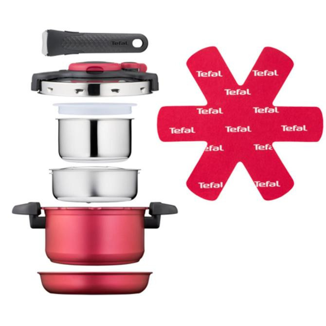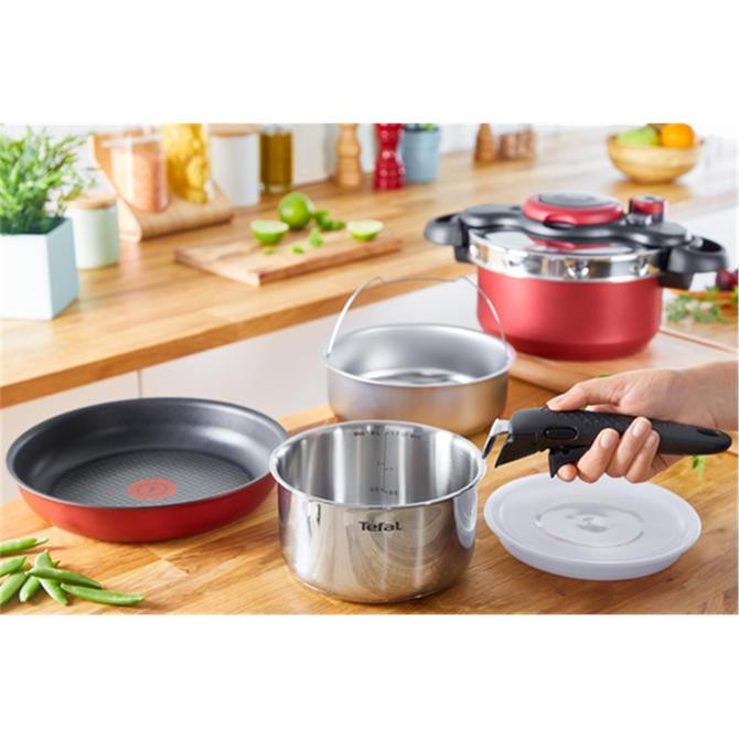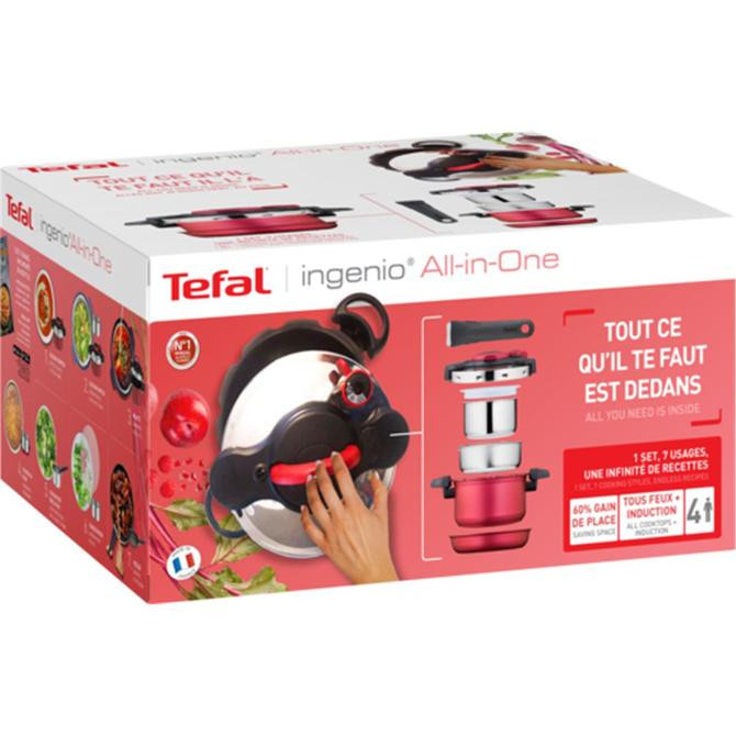 مجموعه پخت 7 تکه همه کاره تفال : درب هوشمند ، قابلمه زودپز نچسب 4 لیتری ، ماهیتابه 24 سانتی متری ، مینی قابلمه 16 سانتی متری از جنس استنلس استیل ، دسته متحرک ، درب ذخیره سازی جهت نگهداری در یخچال ، سبد بخار • 7 حالت مختلف پخت زودپز ، بخارپز ، برشته ، جوشاندن ، خورش ، خورش و سرخ کردن • ذخیره سازی آسان • پخت سالم و سریع • سازگار با تمام اجاق گاز ها از جمله القایی