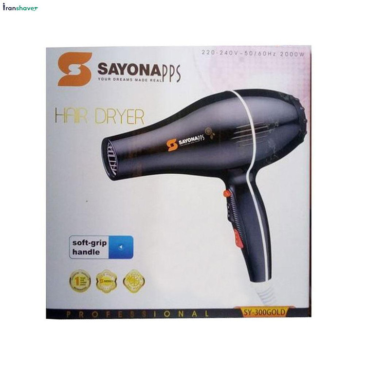سشوار سایونا مدل SY-300GOLD با طراحی زیبا و متریال بسیار با کیفیت جهت استفاده حرفه ای و سالن های ارایش طراحی و تولید شده است. این مدل از سشوار سایونا دارای موتور قدرتمند AC با توان 2000 وات است که در سه حالت دما و دو سرعت جریان باد قابل تنظیم می باشد. این سشوار دارای دکمه باد سرد موقت (کول شات) نیز می باشد که در هنگام تنظیم و استفاده بر روی حرارت داغ بدون عوض کردن تنظیمات و تنها با فشار این دکمه سریعا به باد سرد دسترسی خواهید داشت و با رها کردن آن به حالت قبلی تنظیمات باز خواهید گشت. این مدل از سشوار سایونا به علت کیفیت بالای محصول تولید شده موفق به دریافت استانداردهای تاپ کلاس و ایزو 9002 شده است که بر روی بسته بندی محصول قابل مشاهده است. از دیگر ویژگی های این سشوار می توان به طراحی ارگونومیک و سیم کشی بلند آن اشاره داشت. همرا ه این سشوار دو عدد سری متمرکز کننده جریان باد نیز دریافت خواهید کرد.