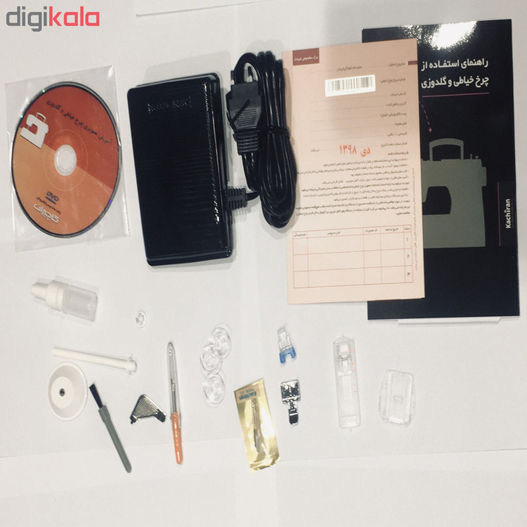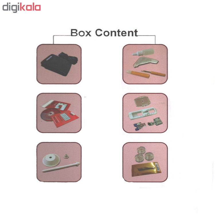 پایه دوخت استاندارد،صفحه گلدوزی،پایه جادکمه،پایه زیپ دوزی،بشکاف،برس تمیزکاری،یک بسته سوزن،میل قرقره متحرک،سی دی و دفترچه آموزشی همراه با کارت ضمانت