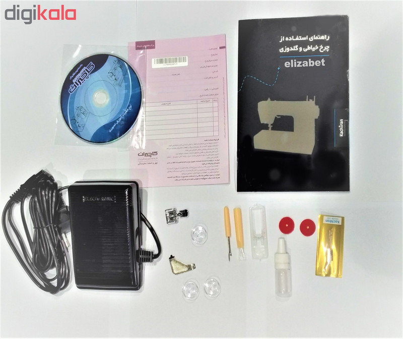 پایه دوخت استاندارد،پایه جادکمه،پایه زیپ دوزی،بشکاف،برس تمیزکاری،یک بسته سوزن،سی دی و دفترچه آموزشی همراه با کارت ضمانت