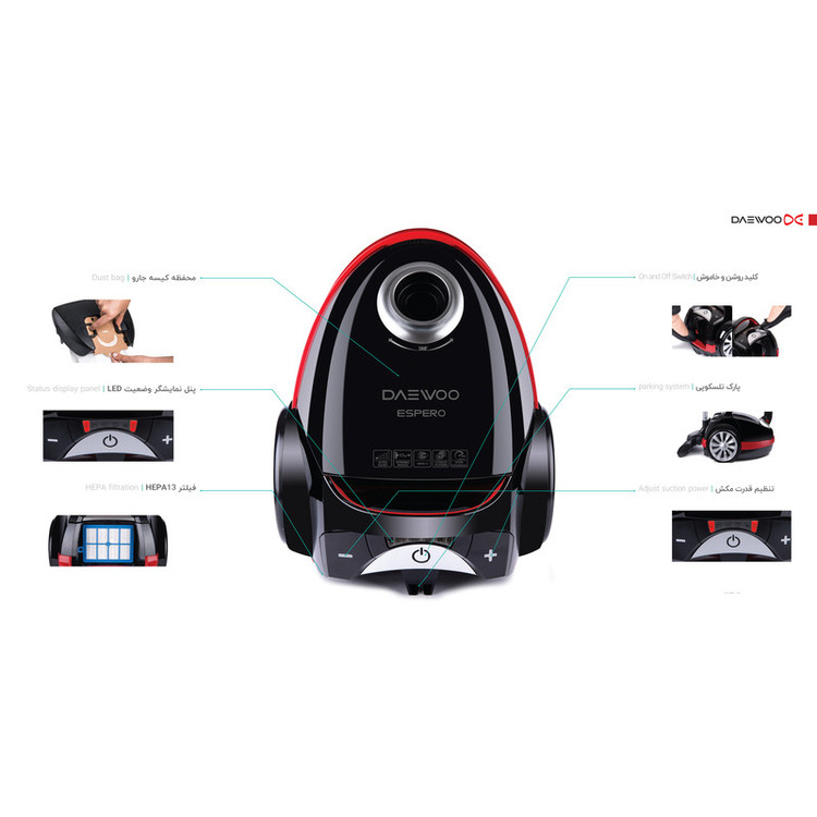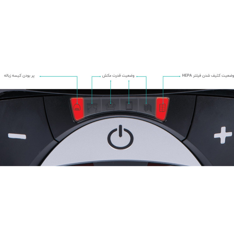 دارای 8 مرحله فیلتراسیون / تنظیم الکتریکی قدرت مکش / کنترل پنل LED روی بدنه / گیره نگه دارنده ملحقات / نشانگر وضعیت فیلتر HEPA
