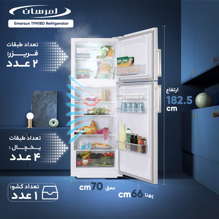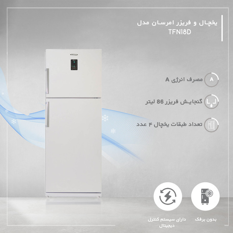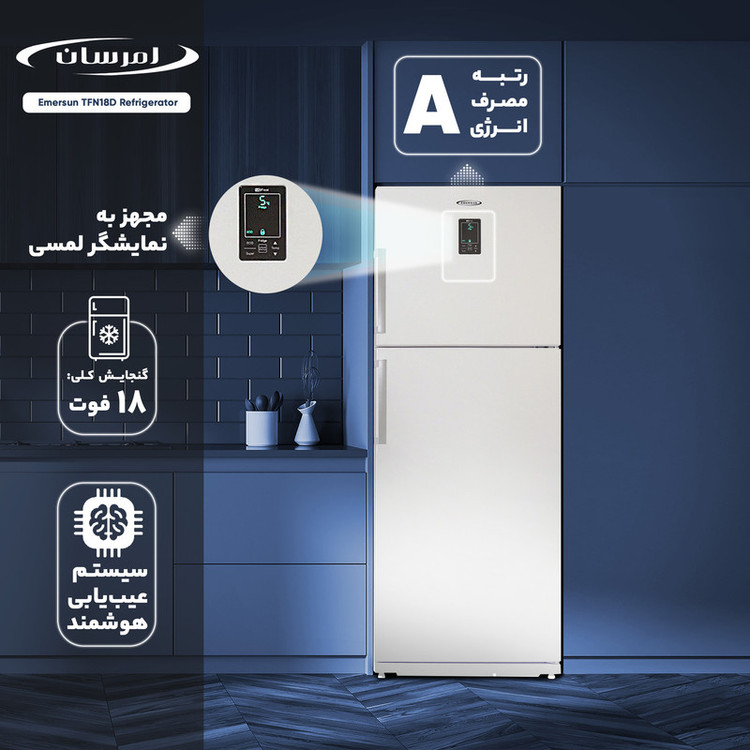 یخچال فریزر 18 فوت مدل «TFN18D» یکی از یخچالهای ساده، بهصرفه و کممصرف از سری یخچالهای بالاپایین شرکت امرسان (Emersun) است که به دلیل فضای مناسب داخل یخچال، یکی از پرطرفدارترین مدل یخچال و فریزرهای ایرانی است. شرکت صنایع امرسان یکی از پیشروهای صنعت در حفاظت از محیط زیست است از این سو امرسان در تولید محصولات لوازم خانگی ایرانی از تمام توان خود جهت تولید محصولات دوستدار محیط زیست استفاده میکند، از این رو گاز تبریدی و مواد مورد استفاده برای عایقبندی این محصول کاملا دوستدار محیط زیست هستند. گنجایش کلی این محصول 380 لیتر است که سهم یخچال 270 لیتر و سهم فریزر 86 لیتر است که فضای نسبتا کمی برای سردکردن و فریز کردن مواد غذایی محسوب میشود. از ویژگیهای این یخچال میتوان به سیستم کنترل دیجیتال مجهز به نمایشگر تاچ پنل، سیستم عیب یابی هوشمند، سیستم گردش هوای اجباری و سیستم انجماد سریع اشاره کرد.