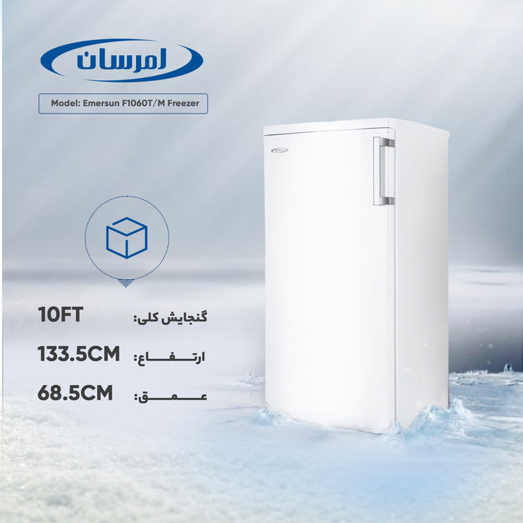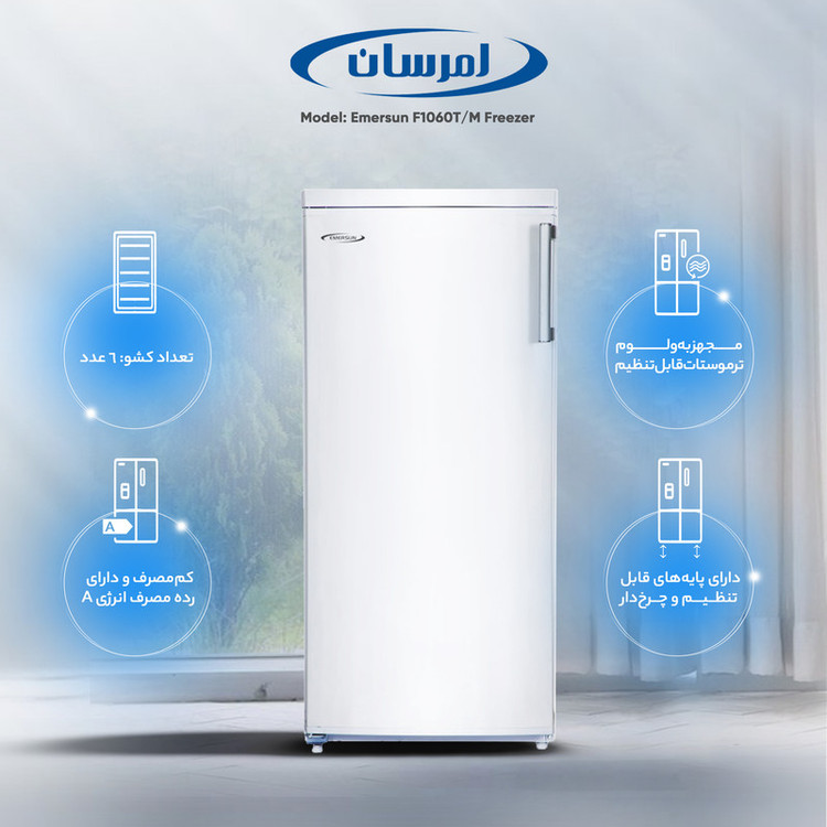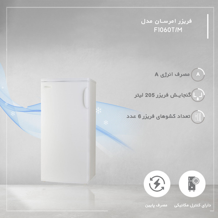 فریزر 10 فوت امرسان مدل F1060T/M، با ارتفاع 133.5، عمق 68.5 و پهنای 60 سانتیمتر، میزان مصرف انرژی A، دارای 6 کشو در فریزر، دارای پایه های قابل تنظیم و چرخ دار