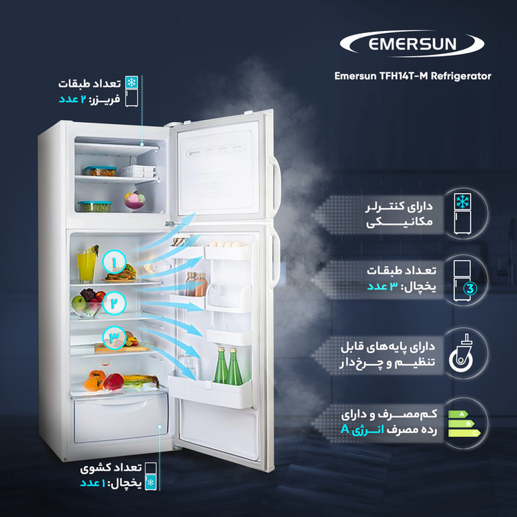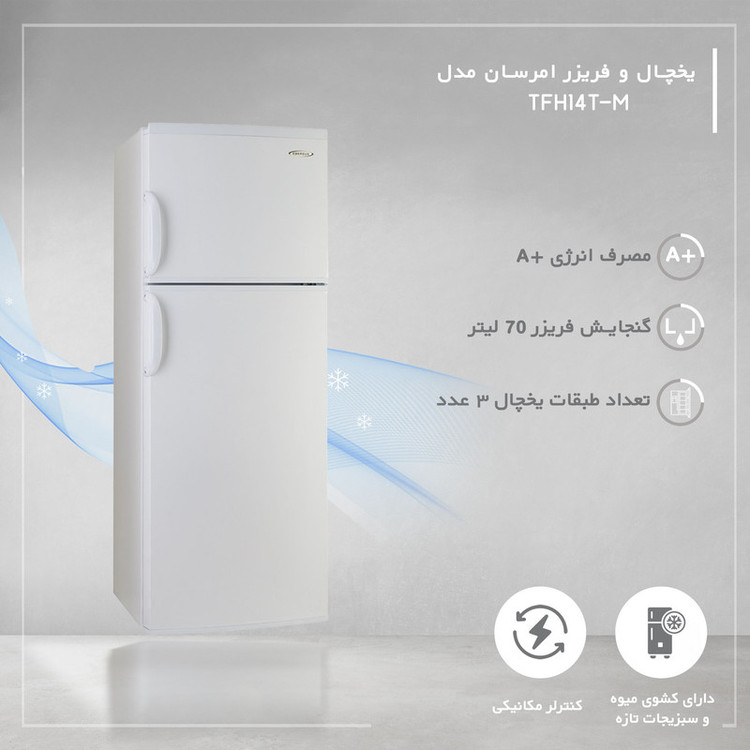 یخچال فریزر امرسان مدل TFH14T-M یکی از یخچالهای کلاسیک از شرکت امرسان با طراحی شیک و ساده و مصرفی پایین است. این یخچال فریزر مدل کمبی از بدنهای با طراحی سفید و جنس فولاد برخوردار است. گنجایش مناسب و ایدهآل یخچال و فریزر به جذابیت آن برای خانوادههای کم جمعیت و شاید خانوادههایی با جمعیت متوسط میافزاید. قسمت یخچال علاوه بر کشوی زیرین که ویژه نگهداری میوه و سبزیجات تازه است، دارای تعداد مناسبی از طبقات اصلی است. روی درب نیز طبقات به گونهای طراحی و تعبیه شده تا کاربر بتواند مواد غذایی مربوطه نظیر تخم مرغ، لبنیات، انواع بطری آب، شیشه موادغذایی نظیر شیشه مربا، پارچ، داروجات و... را به راحتی در مکانی مناسب قرار دهد. طبقات با شیشههای نشکن از یکدیگر جدا شدهاند و لامپ یخچال نیز در آن تعبیه شده است. از دیگر ویژگیهای این یخچال فریزر برخورداری از کنترلر مکانیکی است. یخچال فریزر امرسان مدل TFH14T-M که با توجه به دوطبقه بودن فضای نسبتاً کمی را اشغال میکند، دارای پایههای قابل تنظیم و چرخدار بوده که جابجایی آن را برای قرارگرفتن در محل مناسب آسانتر میسازد.