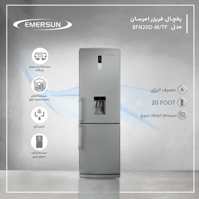 یخچال و فریزر «امرسان» مدل «BFN20D321 » با ارتفاع نزدیک به دو متر، یک یخچال مدرن و کارا بهحساب میآید. این یخچال دارای چهار طبقه در محفظه و چهار طبقه در درب است. سیستم خنککنندهی این یخچال و فریزر از نوع کمپرسور است. مهمترین ویژگی مدل BFN20D321 ، این است که برفک تولید نمیکند و بدون برفک است. گفتنی است فریزر این مدل که دارای سیستم کارکرد مجزا است، این قابلیت را دارد که مواد غذایی را با حالت انجماد سریع فریز کند. این یخچال مجهز به سیستم عیبیاب هوشمند است. سیستم کاهشدهنده مصرف انرژی در این مدل وجود دارد و گردش هوای چندگانه در آن اتفاق میافتد. برای یخچال و فریزر امرسان کنترل پنل در نظر گرفته شده است. پنل LED بر روی درب یخچال قرار داده شده است. نمایشگر این یخچال مجهز به قفل کودک است و آن را میتوان برای حفظ تنظیمات دائما قفل نگه داشت؛ درون این یخچال لامپ روشنایی یخچال تعبیه شده است. مدل BFN20D321 ، دارای آبخوری، و جاتخممرغی است و در آن یک کشوی نگهداری میوه و سبزی هم وجود دارد. آبسردکن این یخچال یک ویژگی جالب دارد و آن اینکه مجهز به قفل کودک است. درون محفظهی یخچال، جالبنیاتی هم قرار داده شده است. پایههای چرخدار یخچال باعث سهولت جابجایی آن شدهاند.