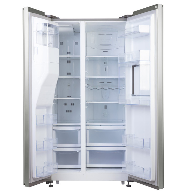 یخچال و فریزر ساید بای ساید امرسان مدل RFR3292D یکی از محصولات محبوب بازار است که با رویکردی همه جانبه سعی بر راضی نگه داشتن خانوادههایی با جمعیت متوسط را دارد. طراحی ساده اما زیبا با هماهنگی بالا با دکوراسیون داخلی و کیفیت ساخت بالا با ورق فولادی، شرایط نگه داری از این محصول را در هر شرایط آب و هوایی به کاری آسان تبدیل کرده است. ظرفیت کلی 599 لیتر با طراحی پنج طبقه یخچال، شش طبقه روی درب و دو کشو در بخش یخچال چیدمان خوبی را به ارمغان میآورد. در فریزر سه طبقه و دو کشو در دسترس کاربران قرار میگیرد. نمایشگر و کنترل لمسی در کنار دستگیرههای عمودی منحنی با وسعت عملکردی زیاد و درب مخفی یا هومبار از جذابیتهای بخش طراحی مدل است. از مهمترین ویژگیهای ساختاری این محصول میتوان به بوگیر با کربن فعال، سیستم بدون برفک و عیب یابی هوشمند اشاره کرد. البته این تمام مشخصات نیست. گردش هوای چندگانه برای تازه ماندن مواد غذایی، یخساز و آبسردکن اتوماتیک با فیلتر تصفیه آب خانگی را باید به مشخصات اضافه کرد. موتور به کار رفته در این ساید بای ساید بیصدا با عملکرد مصرف بهینه انرژی است.