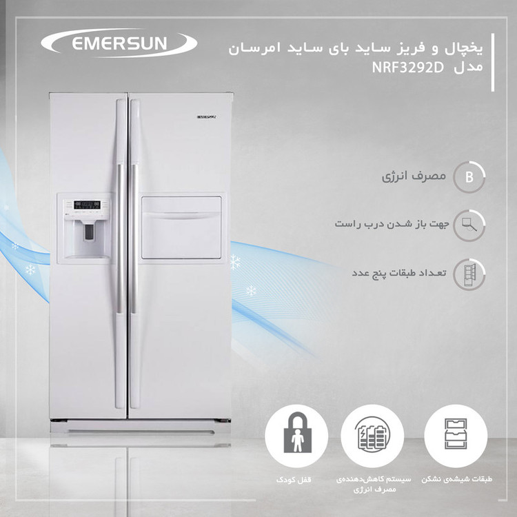 یخچال و فریز ساید بای ساید امرسان مدل NRF3292D از دستگاههای محبوب عرضه شده در بازار توسط این شرکت است. یخچال های سایدبایساید مناسب کسانی است که میخواهند با خرید یک دستگاه هم فریزر هم یخچال داشته باشند و هر دوی اینها هم از بهترینها باشند. یخچال و فریز ساید بای ساید امرسان مدل NRF3292D ظاهری زیبا داشته و به رنگ سفید عرضه شده است. قسمت یخچال سمت راست و فریزر سمت چپ در نظر گرفته شده است. دستگیرهها به صورت برجسته و میلهای طراحی شدهاند و درها را راحت باز میکنند. روی در یخچال دریچه کوچک برای دسترسی به قسمت نوشیدنیها در نظر گرفته شده است. روی در فریزر هم آبریز و پنل کنترلی دستگاه قرار گرفته است. داخل یخچال فضای زیادی وجود دارد و طبقات متعدد این فضا را تقسیم کردهاند. کشوها برای قرار گیری میوه و سبزیجات نیز در نظر گرفته شده است. در یخچال مدل NRF3292D در سطح داخلی طبقات متعدد و بزرگ وجود دارد تا بطری و مواد مختلف در آنها قرار گیرند. طبقات مختلف در فریزر و کشوهای در نظر گرفته شده فضای کافی برای منجمد کردن مواد غذایی مختلف ایجاد میکنند. روی در فریزر هم طبقات کوچکی برای فریز کردن مواد در ظروف کوچک در نظر گرفته شده است. این دستگاه از سیستم کاهش دهنده مصرف انرژی و سیستم گردش هوای چند قسمتی بهره میبرد. برای تهیه یخ و ارائه آب سرد باید به شیر آب شهری متصل شود. طبقات آن شیشهای و نشکن بوده و سبدها پلاستیکی است. امرسال تولید و عرضه کننده لوازم خانگی برقی است که برای مشتریان به خوبی شناخته شده است.