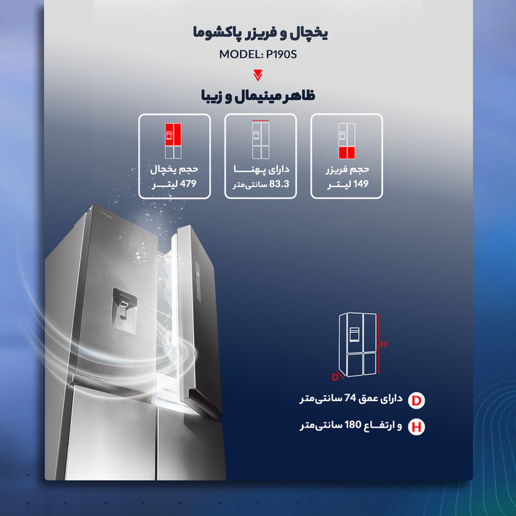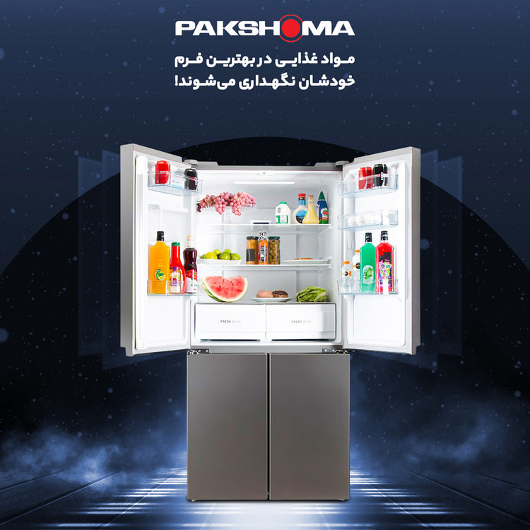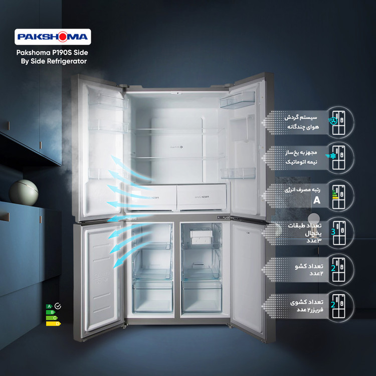 یخچال و فریزر ساید بای ساید پاکشوما مدل 4D RDP 530 W یکی از زیباترین و حرفهایترین محصولات شرکت ایرانی پاکشوما است که وارد بازار شده است. این یخچال و فریزر دارای 4 در است که از طراحی بینظیری بهرهمند است و زیبایی خاصی به آشپزخانه شما میدهد. ساید بای ساید چهار در پاکشوما مدل 4D RDP 530 W مجهز به فناوری های بهروزی مانند سیستم اکونومی است که در زمانی که شما به سفر میروید میتواند بسیار مفید واقع شود و مصرف برق را به اندازه چشمگیری پایین بیاورد. کمپرسور با عملکرد بهینه سرمایش مورد نیاز را تامین میکند. از دیگر فناوریهای دیگر که میتوان به آن اشاره داشت سیستم گردش هوای چند گانه بوده که میتواند هوای داخل یخچال را تازهتر و نگاه دارد و تمامی قسمتهای یخچال و فریزر با تناسب به نوع کاری که انجام میدهد را یکسان نگاه دارد. از جمله ویژگیهای یخچال های امروزی دارا بودن آبسردکن و یخسازی قدرتمند است. یخچال و فریزر ساید بای ساید پاکشوما مدل 4D RDP 530 W دارای آبسردکن و یخسازی کارآمد نیمه اتوماتیک است.