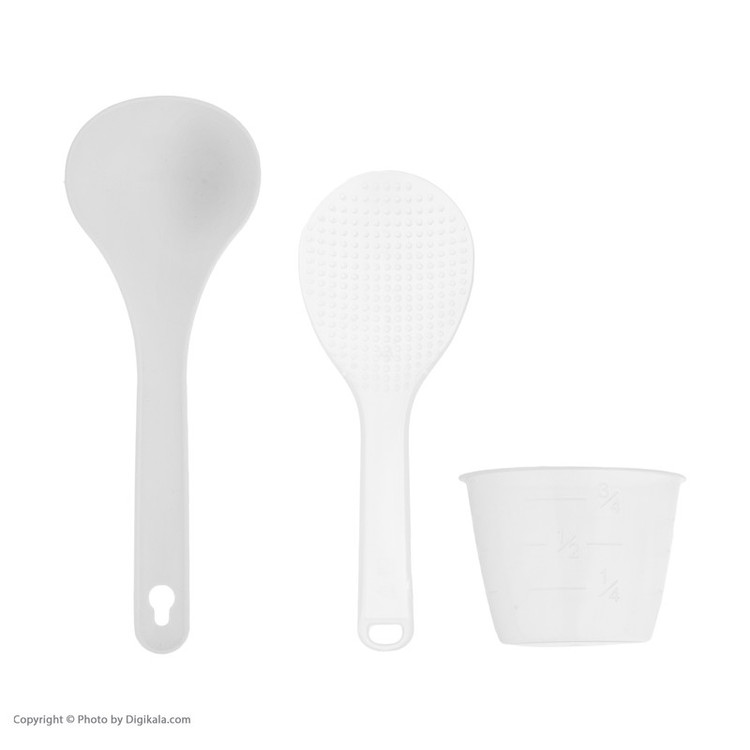 یک عدد ملاقه یک عدد کفگیر یک پیمانه ظرف توری برای سرخ کن سینی بخارپز کردن سیم برق