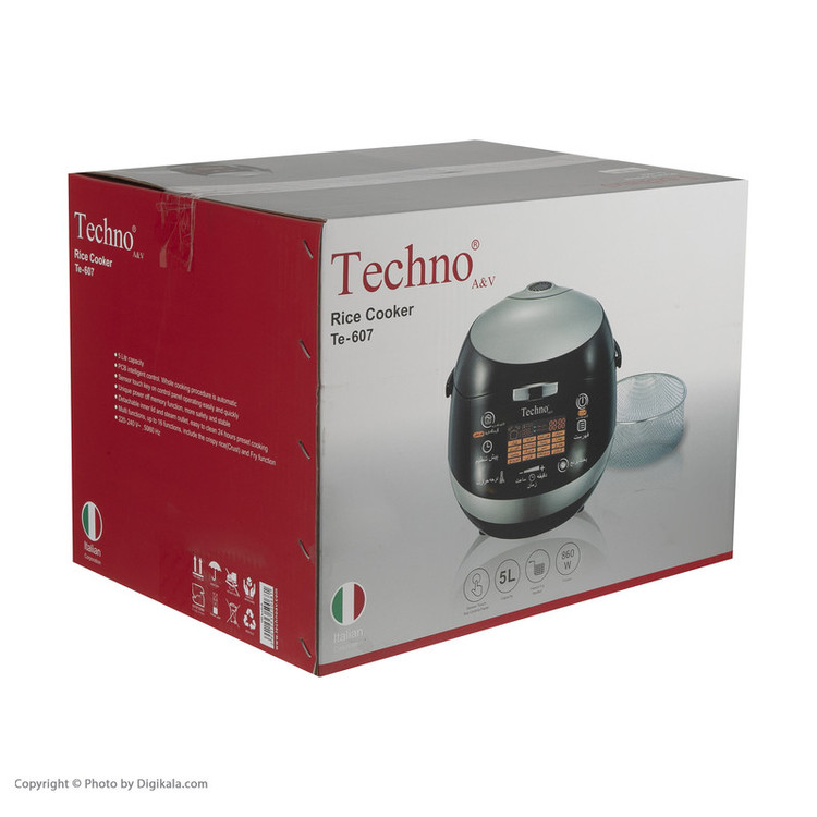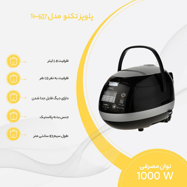 پلوپز 10 نفره تکنو مدل Te-60، از دیگر لوازم پیشرفته با فناوریهای مدرن است که با بهرهگیری از توان 1000 وات و طراحی بسیار زیبا به بازار عرضه شده است. بدنه این محصول از پلاستیک ساخته شده که علاوه بر مقاوم بودن و طول عمر بالای دستگاه نیز دارد. این پلوپز تکنو به دلیل بهرهگیری از عملکردهای مختلف، کار پختوپز را سهل میسازد و امکان پخت برنج، خورش، کیک و دیگر غذاهای متنوع را میسر میسازد. تکنو برای جلب رضایت هر چه بیشتر مشتریان، قابلمه این پلوپز دیجیتالی را به صورت دو لایه تفلون ارائه کرده تا با اطمینان خاطر بتوان کیک و یا تهدیگهای خوشرنگ و طلایی را آماده کرد. ظرفیتی که تکنو برای Te-607 در نظر گرفته شده، 1.8 لیتر است که این میزان برای خانوادههایی با جمعیت 8 تا 10 نفر مناسب خواهد بود. تایمر قابل تنظیم 24 ساعت و قابلیت گرمنگه دارندگی از دیگر ویژگیهای قابلتوجه این پلوپز زیبا و کاربردی است و برای علاقهمندان به آشپزی که به دنبال راه آسان برای پختوپز هستند، انتخاب ایده آلی است.