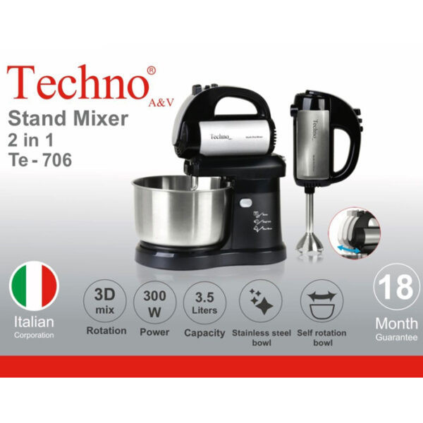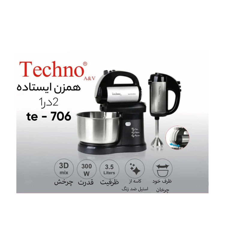 همزن کاسه دار تکنو مدل Te-706 محصولی با طراحی خاص و زیباست که برای مصارف خانگی تولید شده و با توان مصرفی 300 واتی که دارد، به راحتی می توان مواد غذایی همچون خمیر کیک، خامه، تخم مرغ، سس و … را آماده نمود همزن کاسه دار تکنو مدل Te-706 به گونه ای ساخته شده تا بتوان در صورت لزوم هم به صورت دستی و هم با اتصال به پایه از آن استفاده نمود. بدنه دستگاه از پلاستیک مقاوم و باکیفیت می باشد و این همزن کاسه دار تکنو به دو سری همزن، خمیرزن و گوشتکوب مجهز گردیده که از جنس استیل مرغوب تهیه شده اند.