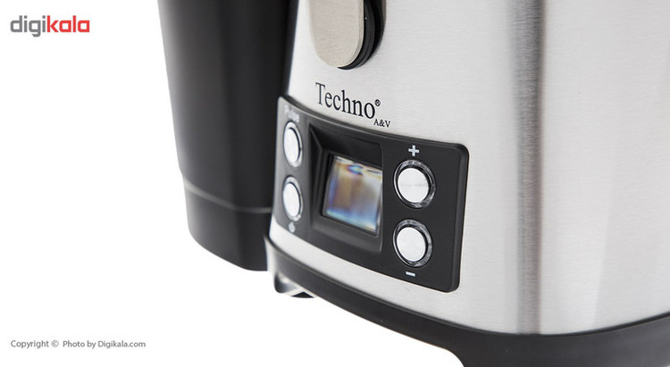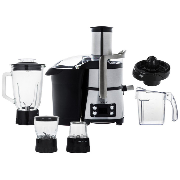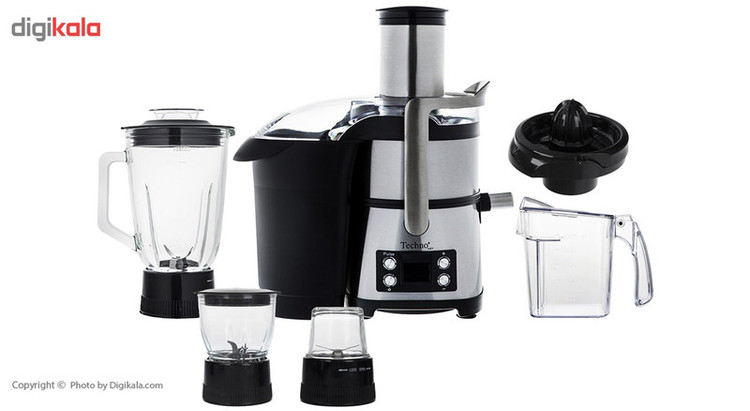 آبمیوهگیری مدل «Te-310» یکی از این محصولات کاربردی و خوشساخت برند «تکنو» است که عملکردهای متفاوتی دارد. این دستگاه علاوهبر قابلیت آبمیوهگیری دارای یک پارچ مخلوطکن است؛ همچنین یک عدد ظرف آسیاب، خردکن و یک قطعهی مخصوص گرفتن آب مرکبات در کنار این دستگاه ارائه میشود. بدنهی این آبمیوهگیر از جنس استیل و مقاوم در برابر زنگزدگی است. روی بدنهی دستگاه دکمههای فشاری مخصوص اعمال تنظیمات تعبیه شده است. موتور 800 وات دستگاه در دو سرعت متفاوت کار میکند و از توان آبگیری فوقالعادهی 80درصد برخوردار است. علاوهبراین در صورتی که سروکارتان با مواد سفت و سخت بیفتد، به کمک عملکرد پالس که با علامت P مشخص شده است، میتوانید از پس آنها برآیید. عملکرد پالس حالتی است که در آن موتور با سرعت زیاد و به صورت ناگهانی کار میکند و با کارکرد مخصوص خود امکان خردکردن مواد سفت را به کاربر میدهد. از دیگر ویژگیهای کاربردی این دستگاه دهانهی ورودی عریض آن است که بهراحتی میوههای درسته را در خود جای میدهد. مخزن تفالهای برای این دستگاه در نظر گرفته شده است که تا ظرفیت 2 لیتر قادر به ذخیرهسازی تفاله است. پایههای این مدل بهگونهای طراحی شدهاند که از لغزش دستگاه در حین کار جلوگیری میکنند.